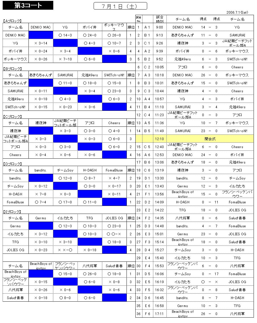 第11回ビーチフットボール白浜大会 予選リーグ試合結果 〔2006.7.1〕